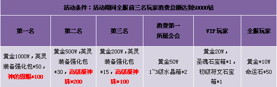 1. 每天全服消费前3名玩家,3名玩家共同消费满5W钻,方可领取奖励;