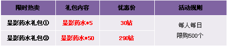 【活动内容】活动期间,商城热卖折扣出售显影药水礼包。还在为高级公会技能发愁吗?赶快抢购吧!
