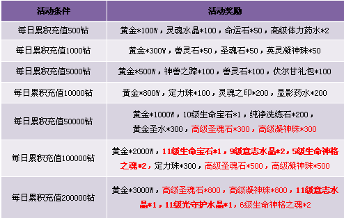 1. 每日累积充值达到1000钻石可同时获得累积充值1000和500档次的两重奖励,依此类推;
