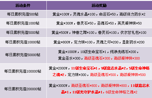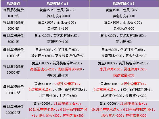 3. 活动期间累计消费满足条件可领取奖励,每重奖励玩家只能领取一次, 请留意领取活动奖励。