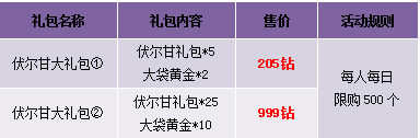 【活动内容】活动期间,伏尔甘礼包搭配大袋黄金特价出售,小伙伴们再也不用为神铸黄金不够发愁啦,赶快行动吧!