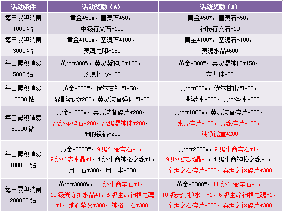 3. 活动期间累计消费满足条件可领取奖励,每重奖励玩家只能领取一次,请留意领取活动奖励;