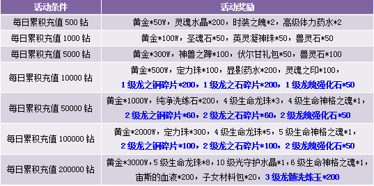 1. 每日累积充值达到1000钻石可同时获得累积充值1000和500档次的两重奖励,依此类推;