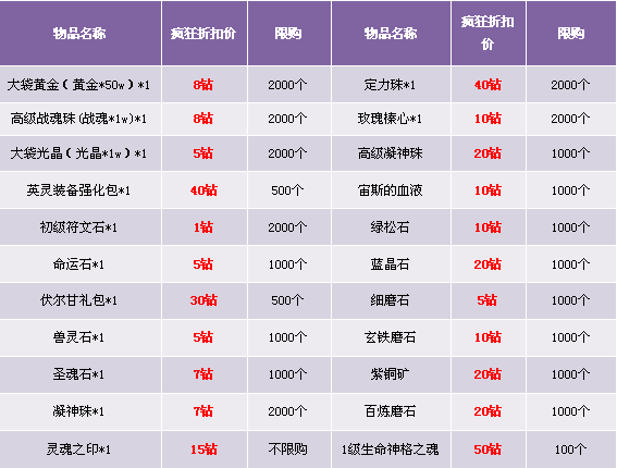 2. 限时热卖区域中的道具仅限“钻石”购买, 购买物品均为绑定。.