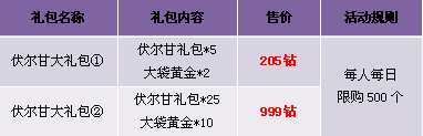 【活动内容】活动期间,伏尔甘礼包搭配大袋黄金特价出售,小伙伴们再也不用为神铸黄金不够发愁啦,赶快行动吧!