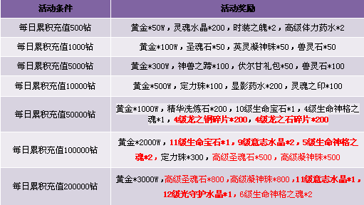 1. 每日累积充值达到1000钻石可同时获得累积充值1000和500档次的两重奖励,依此类推;