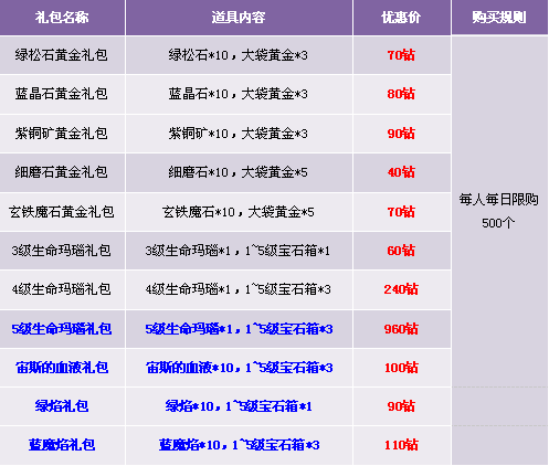 1. 优惠礼包在商城“限时热卖区”出售,限时热卖区域中的道具仅限“钻石”购买;