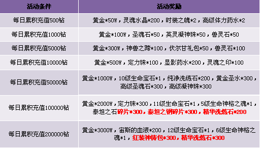 1. 每日累积充值达到1000钻石可同时获得累积充值1000和500档次的两重奖励,依此类推;