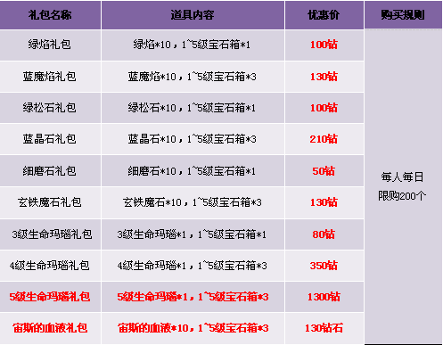 1. 优惠礼包在商城“限时热卖区”出售,限时热卖区域中的道具仅限“钻石”购买;