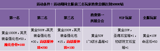 1. 每天全服消费前3名玩家,3名玩家共同消费满5W钻,方可领取奖励;
