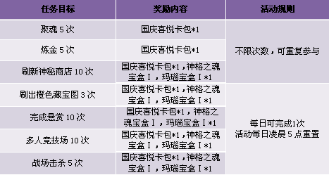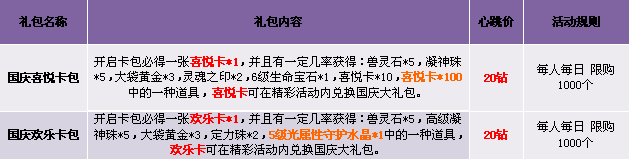 【活动内容】活动期间,商城限时上架国庆喜悦卡包、国庆欢乐卡包、喜悦卡与欢乐卡均可兑换超值豪礼,炫酷时装、全新坐骑、龙语者装备材料任你拿!