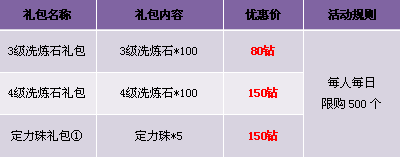 【活动内容】活动期间,商城上架洗练石礼包。低价享受洗练石,轻松提升装备属性。