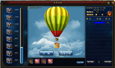 【活动内容】活动期间,在天空寻宝中充能,气球上升到一定高度即可以获取对应高度活动宝藏,使用能源石可以使热气球高度上升,上升越高可获取宝藏越丰富。一次消耗50个道具进行高级充能,有机率出现祝福效果。