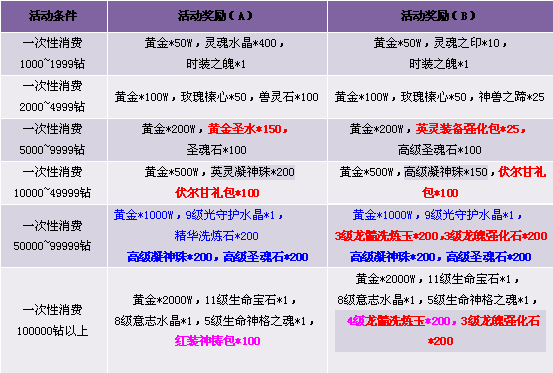 【活动内容】活动期间,一次性消费有好礼!千万黄金,高级守护水晶意志水晶,还有神格之魂,快来享受疯狂福利。