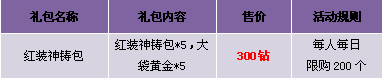 【活动内容】活动期间,红装神铸包搭配大袋黄金特价出售,小伙伴们再也不用为神铸黄金不够发愁啦,赶快行动吧!