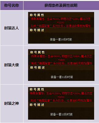 合成一套10、11、12阶时装装备后还能额外获得以下特殊称号: