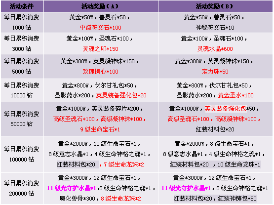 3. 活动期间累计消费满足条件可领取奖励,每重奖励玩家只能领取一次, 请留意领取活动奖励。