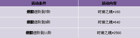 【活动内容】活动期间,玩家时装升阶到7阶及以上,可获得奖励时装之魄。升阶翅膀提升战力,成就一代战将之王!