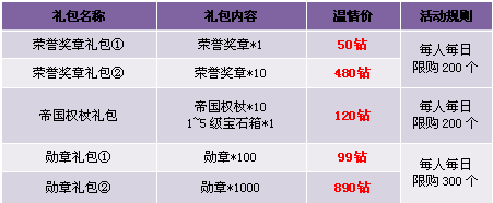 【活动内容】活动期间,商城上架特价荣誉奖章礼包、帝国权杖礼包。冲刺荣誉巅峰,做人生赢家。