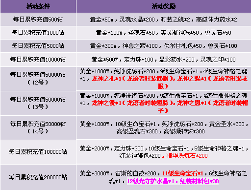 【活动内容】活动期间,累积充值指定金额,即可获得超值大礼。高级宝石、龙语者装备材料,各种珍贵道具等你来拿!