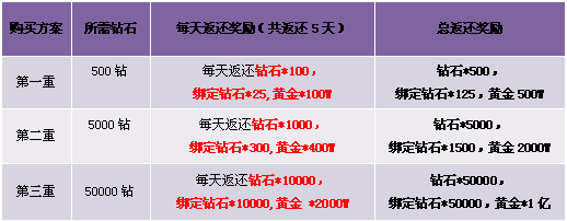 【活动内容】:号外!号外!钻石黄金大返利,活动期间,玩家参加钻石矿脉活动,百分百返还等价额的钻石,还可额外获赠绑定钻石和大量黄金喔!
