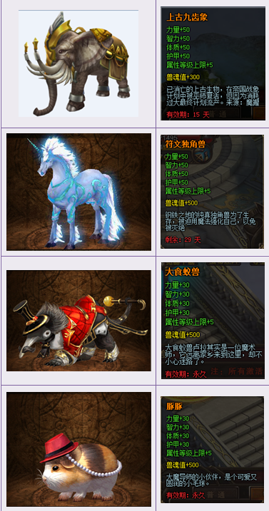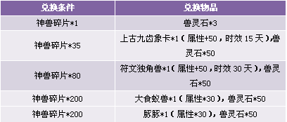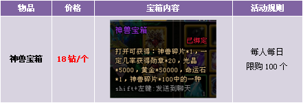 【活动内容】活动期间,商城上架神兽宝箱,18钻一个,收集一定数量的神兽碎片可以兑换各种稀有坐骑。
