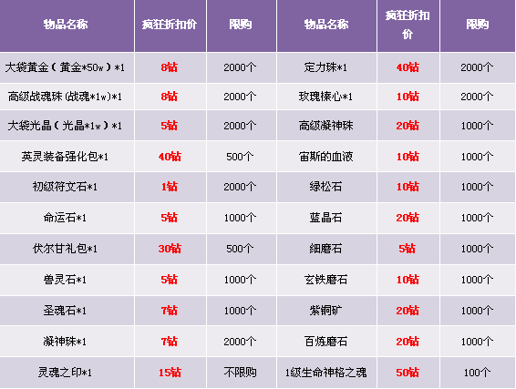 1. 礼包仅在商城“限时热卖”处出售,道具仅限“钻石”购买;