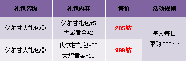 【活动内容】活动期间,伏尔甘礼包搭配大袋黄金特价出售,小伙伴们再也不用为神铸黄金不够发愁啦,赶快行动吧!