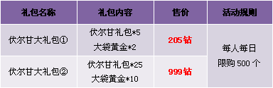 【活动内容】活动期间,伏尔甘礼包搭配大袋黄金特价出售,小伙伴们再也不用为神铸黄金不够发愁啦,赶快行动吧!