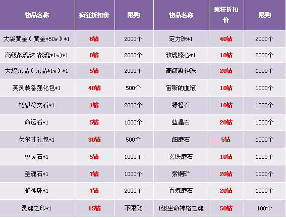 2. 限时热卖区域中的道具仅限“钻石”购买,购买物品、奖励物品均为绑定。