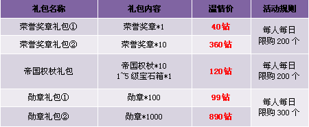 【活动内容】活动期间,商城上架特价荣誉奖章礼包、帝国权杖礼包。冲刺荣誉巅峰,做人生赢家。