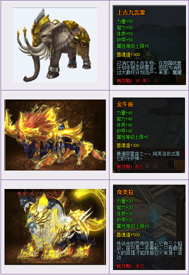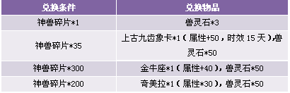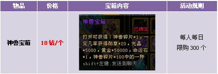 【活动内容】活动期间,商城上架神兽宝箱,18钻一个,收集一定数量的神兽碎片可以兑换各种稀有坐骑。