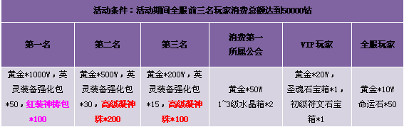 1. 每天全服消费前3名玩家,3名玩家共同消费满5W钻,方可领取奖励;