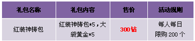 【活动内容】活动期间,红装神铸包搭配大袋黄金特价出售,小伙伴们再也不用为神铸黄金不够发愁啦,赶快行动吧!