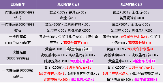 【活动内容】活动期间,一次性充值指定金额,即可获得超值大礼。高级凝神珠、高级圣魂石、高级宝石、守护水晶,各种珍贵子女道具,充值拿钻石得奖励。