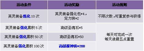 【活动内容】活动期间,炼化、强化英灵装备达到指定次数,即可获得相应奖励。铸就属于你的极品英灵装备,打造新一代英灵王中王。