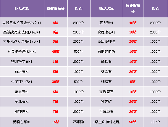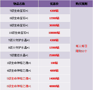1. 礼包仅在商城“限时热卖”处出售,道具仅限“钻石”购买;