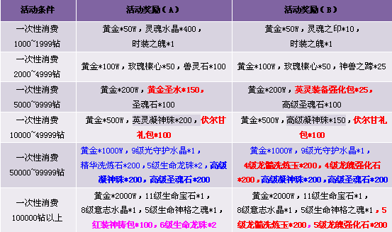 3. 活动期间累计消费满足条件可领取奖励,每重奖励玩家只能领取一次, 请留意领取活动奖励。
