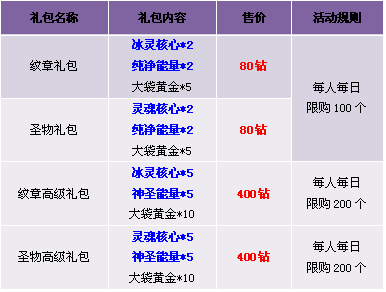 【活动内容】活动期间,纹章圣物材料礼包搭配大袋黄金特价出售,从此紫色品质纹章圣物触手可及!