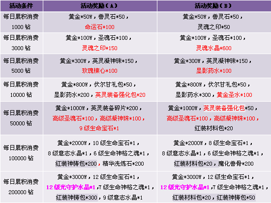 3. 活动期间累计消费满足条件可领取奖励,每重奖励玩家只能领取一次, 请留意领取活动奖励。