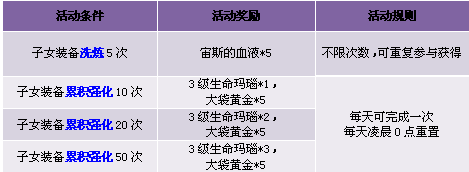 2. 子女装备累积强化,每档每日可完成一次,活动每天凌晨0点重置;