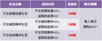 【活动内容】活动期间,商城上架子女战徽提升系列礼包。