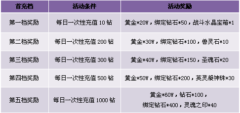 1. 每日首次充值10钻以上即可获得第一档奖励,领完本档奖励可充值参加下一档活动,第二次一次性充值200钻以上可以获得第二档奖励,以此类推,一次充值达到条件领取对应档礼包一份;