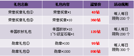 【活动内容】活动期间,商城上架特价荣誉奖章礼包、帝国权杖礼包。冲刺荣誉巅峰,做人生赢家。