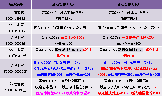 1. 活动期间,单个角色达到指定充值金额,即可获得幸运宝盒,次数不限,例如累积充值4000钻,可获得幸运宝盒8个, 奖励物品均为绑定;