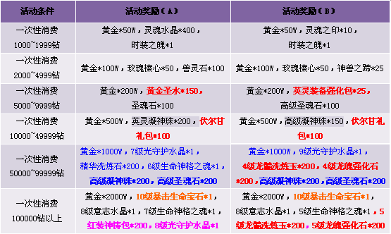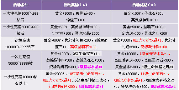 【活动内容】活动期间,一次性充值指定金额,即可获得超值大礼。高级凝神珠、高级圣魂石、高级宝石、守护水晶,红装神铸包等,充值拿钻石得奖励。