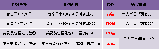 1. 礼包仅在商城“限时热卖”处出售,道具仅限“钻石”购买;