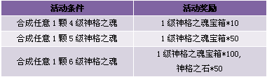 【活动内容】活动期间,商城上架神格之魂礼包,合成指定神格之魂,可获得相应奖励。