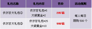 【活动内容】活动期间,伏尔甘礼包搭配大袋黄金特价出售,小伙伴们再也不用为神铸黄金不够发愁啦,赶快行动吧!