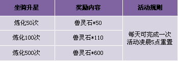 【活动内容】活动期间,坐骑升星超值大返还,炼化更送兽灵石好礼,赶快把你的神兽培养起来吧!